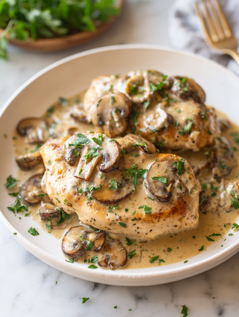- Plate the chicken, spoon plenty of the creamy mushroom sauce over each piece, and serve immediately for a comforting, elegant meal.