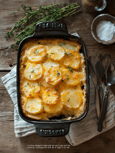 Step 6: Layer the potato slices in a buttered baking dish, seasoning each layer with salt and pepper.