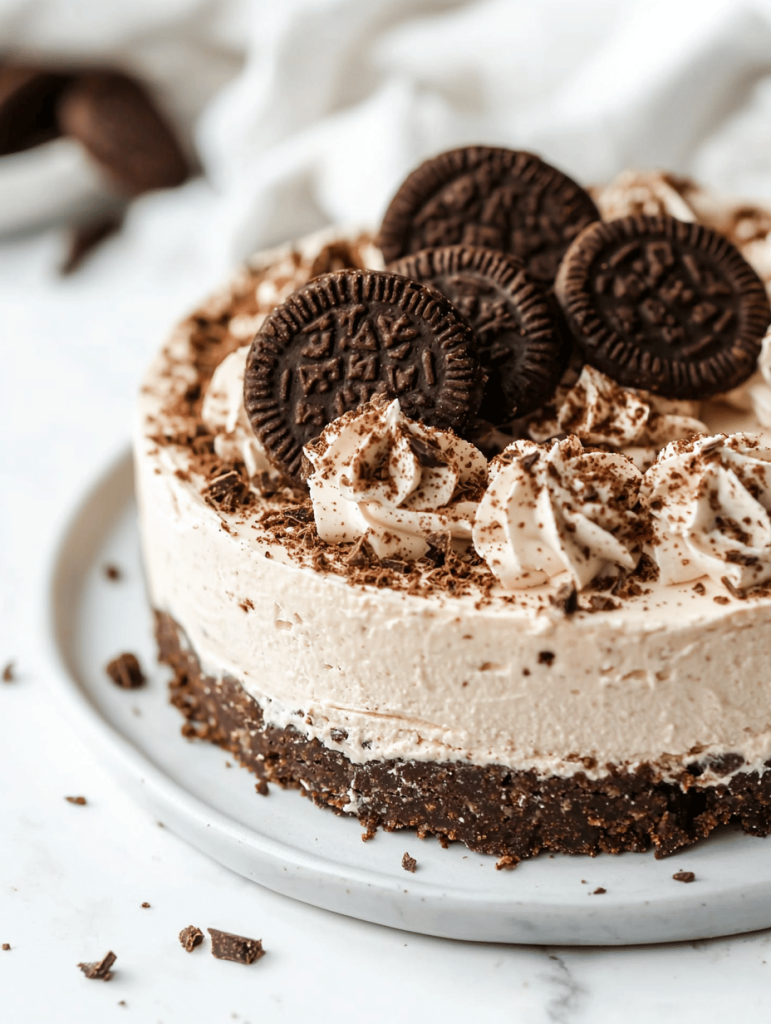This cheesecake features a smooth, creamy filling combined with crushed cookie layers that add a satisfying crunch. The crust is made from crushed cookies mixed with butter, and the filling is a velvety cream cheese mixture that is poured over the crust and topped with cookie crumbs. The final dessert has a firm yet silky texture, with a visually appealing contrast between the creamy filling and crunchy topping.
