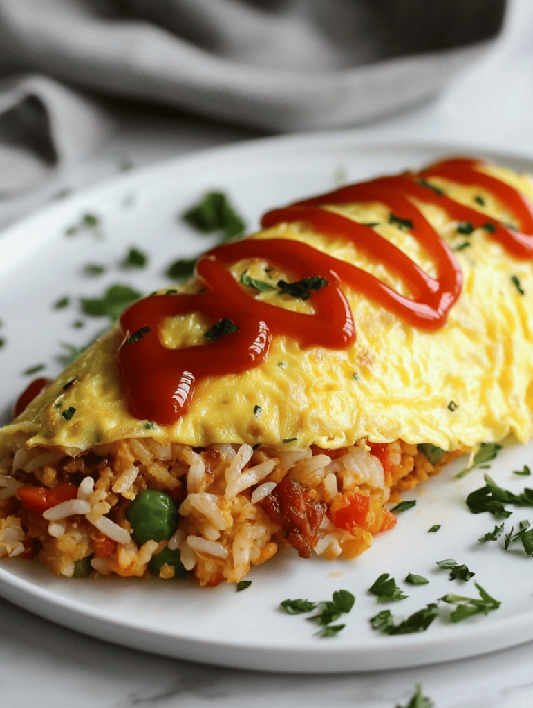 Omurice is a Japanese fusion dish that combines seasoned, ketchup-infused fried rice with a fluffy, folded omelet. The dish features a silky omelet that gently envelops savory rice, resulting in a harmonious and visually appealing final presentation with contrasting textures of tender rice and airy eggs.