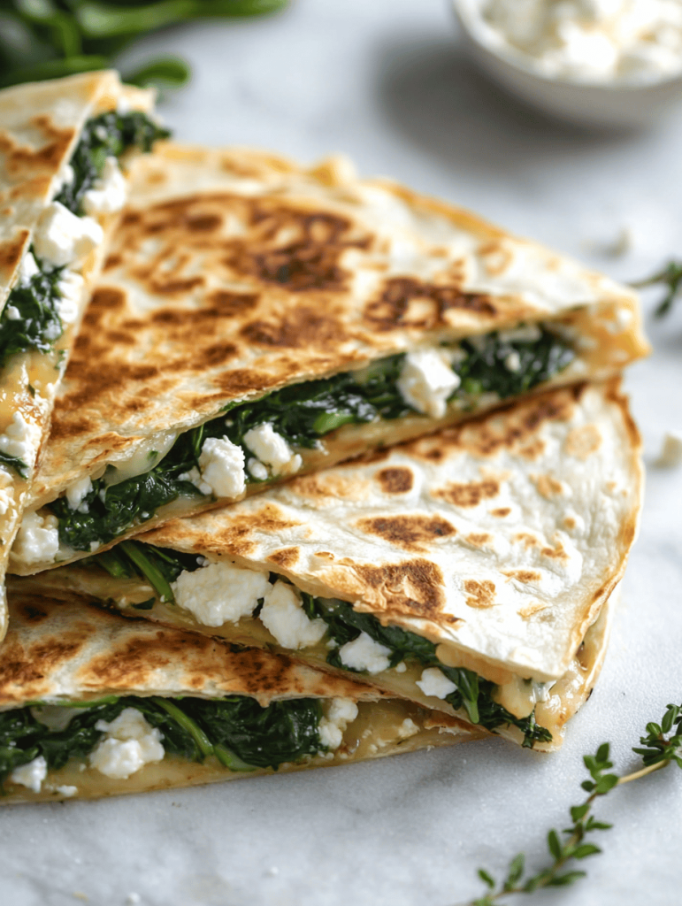 - Repeat the process with the remaining tortilla, feta, and spinach. Serve the quesadillas warm, ideally with a side of fresh salad or salsa if desired.