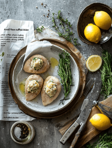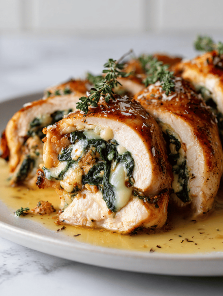 This dish features tender chicken breasts filled with a flavorful mixture of spinach, cheese, herbs, and garlic. The chicken is seared until golden and then baked to perfection, resulting in a crispy exterior and gooey, savory interior that looks impressive on the plate. It’s a versatile and forgiving recipe perfect for a cozy yet elegant meal.