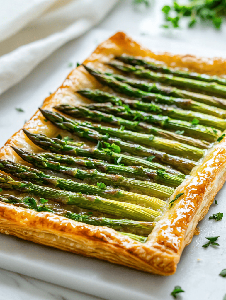 This tart features thin slices of asparagus baked atop flaky, golden puff pastry. The dish combines tender asparagus with a crisp pastry crust, creating a visually appealing and texturally contrasting final result with a savory, lightly toasted almond flavor.