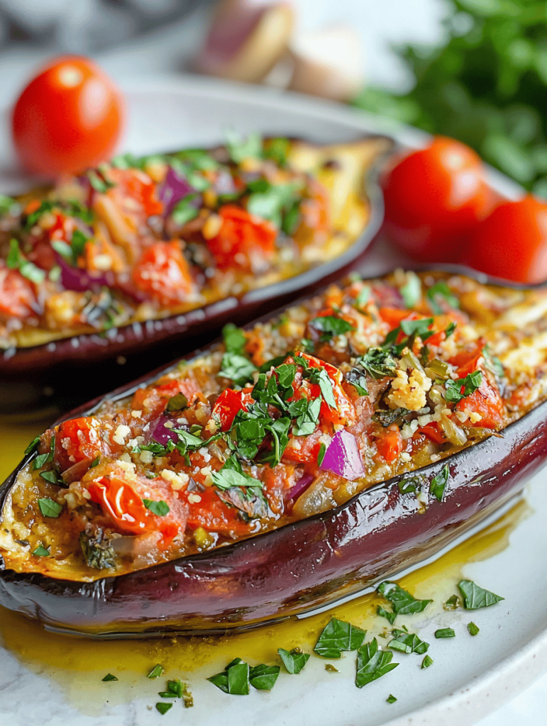 When I prepare this dish, I love how the roasted eggplant shells act as natural bowls—earthy vessels holding a colorful, savory stuffing that’s both hearty and fresh. It’s about more than just eating; it’s about making a sculpture that’s as visually inviting as it is delightful to eat.