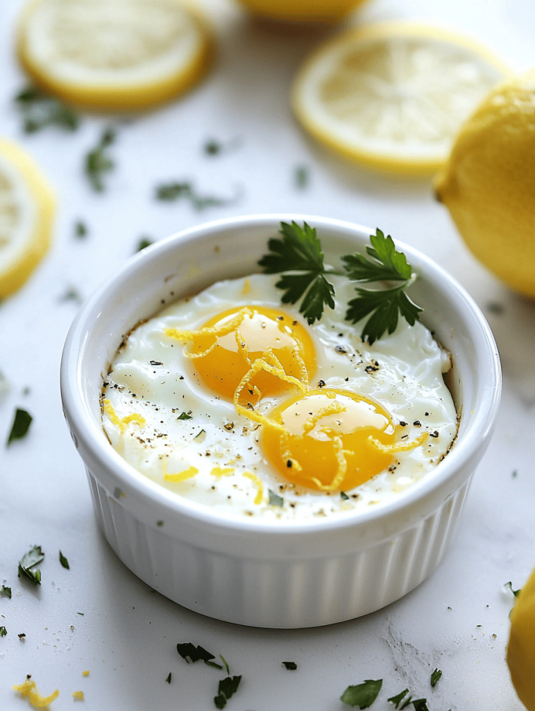 Lemon Baked Eggs are a simple dish where eggs are gently baked until the whites set and the yolks remain runny, infused with bright lemon flavor. The eggs are combined with lemon juice, zest, and seasonings before baking in a ramekin or small ovenproof dish, resulting in a tender texture with a citrus aroma.