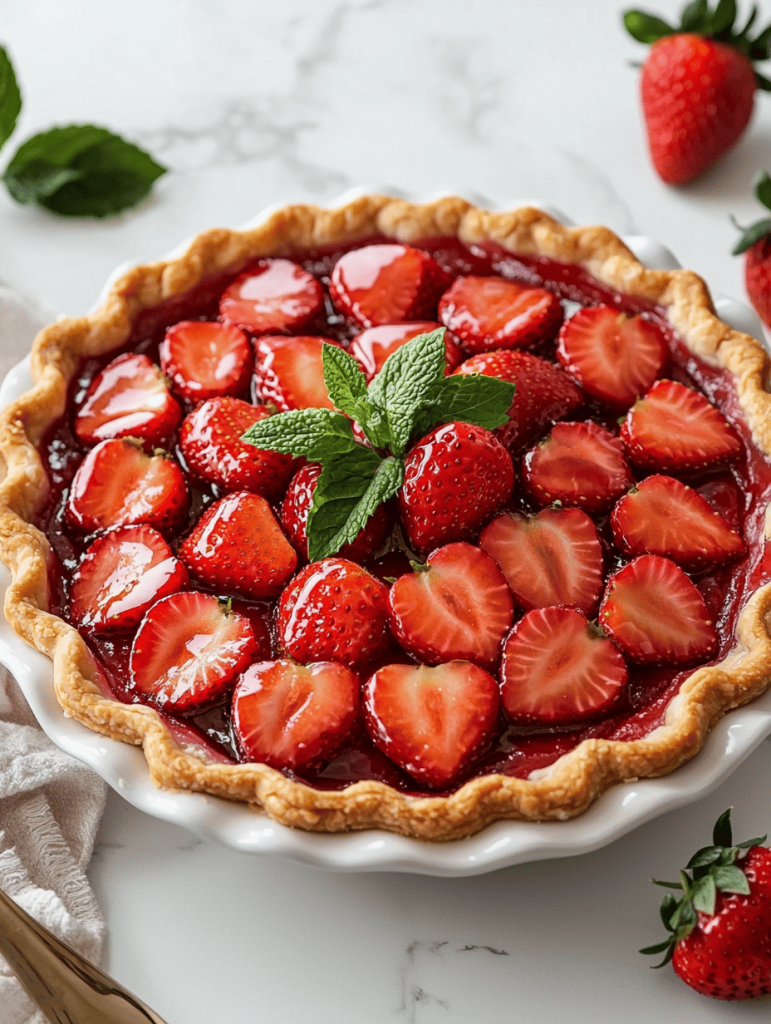 5. Just before serving, arrange fresh strawberry slices on top of the filling for decoration. Optionally, brush strawberries with a light glaze or honey for extra shine. Slice the pie and serve chilled, showcasing the glossy, fruit-filled filling topped with vibrant berries.