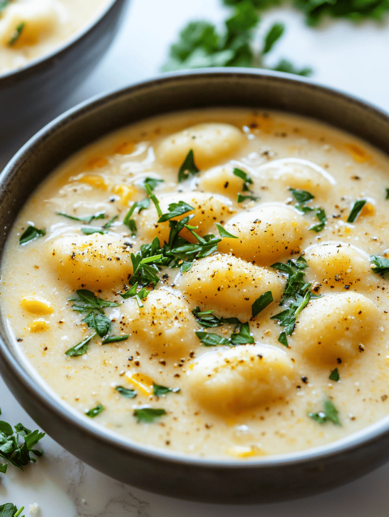 This soup features tender chicken, fluffy gnocchi, and fresh greens simmered in a flavorful broth with garlic and herbs. The gnocchi cook quickly and absorb the savory aromatics, resulting in a hearty yet light-textured dish with a clear, inviting appearance.